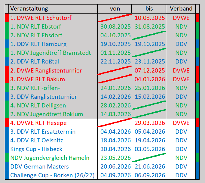 NDV – Auf Landesebene könnt ihr im Niedersächsischen Dartverband Niedersachsenweit die Ranglistenturniere, Jugendtreffs, Niedersachsenmeisterschaften und den Jugendvergleich spielen. Der NDV betreut die Jugendlichen, die sich über die Ranglistenturniere für DDV-Turniere qualifiziert haben.